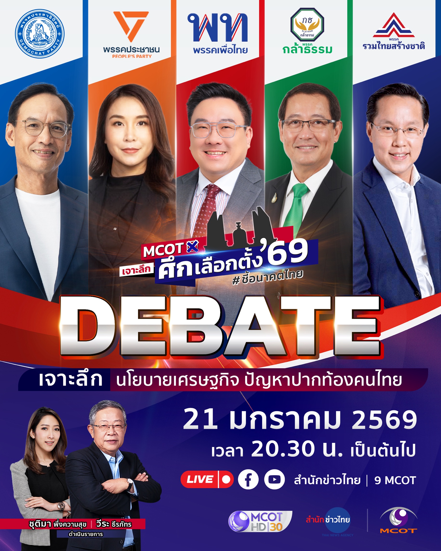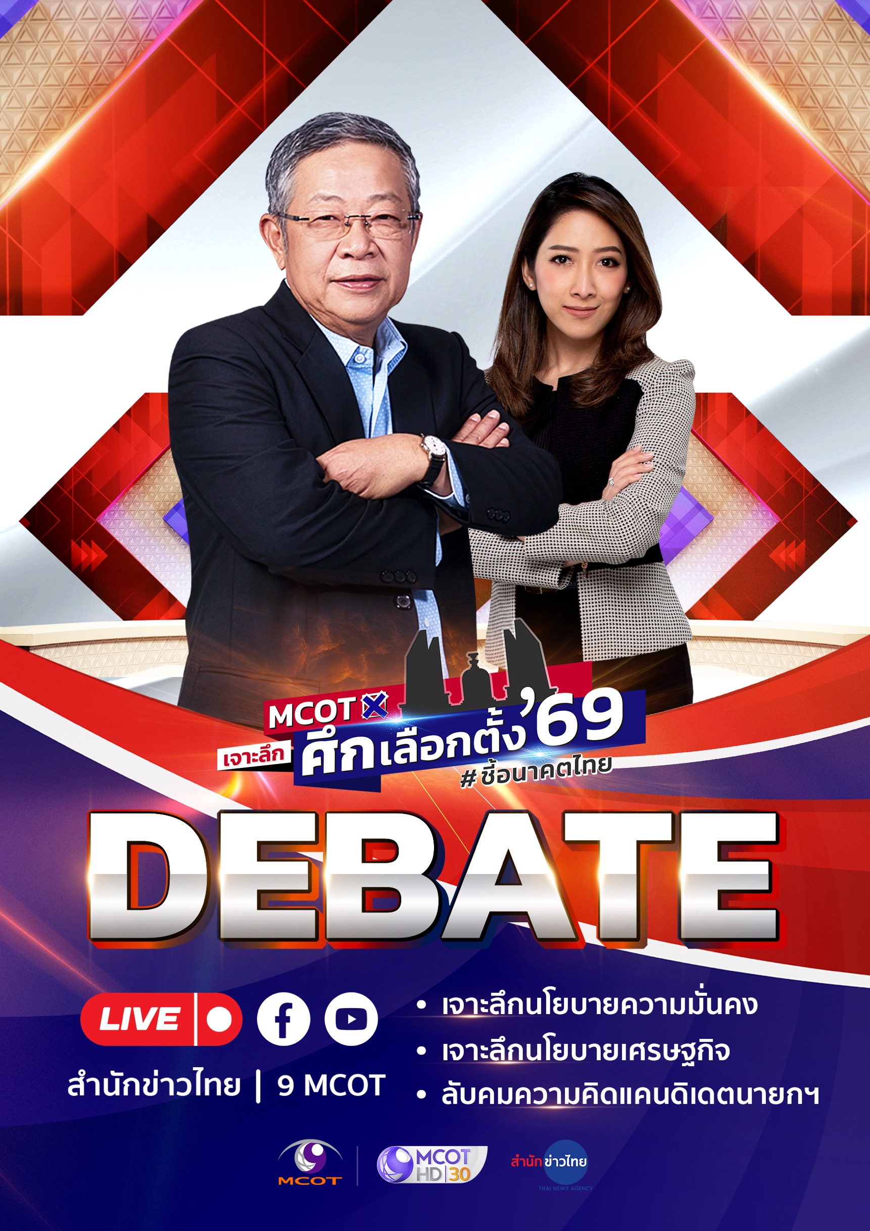 “MCOT เจาะลึกศึกเลือกตั้ง69 #ชี้อนาคตไทย” DEBATE (Live) โดย อาจารย์วีระ ธีรภัทร และ นุ่น ชุติมา พบกับการเจาะลึกนโนบายความมั่นคง นโยบายเศรษฐกิจ พร้อมลับคมความคิดแคนดิเดตนายกฯ ห้ามพลาดในวันพุธที่ 21 มกราคมนี้ เวลา 20.30 น. พบกับ คุณกรณ์ จาติกวณิช แคนดิเดตนายกรัฐมนตรี พรรคประชาธิปัตย์, คุณศิริกัญญา ตันสกุล แคนดิเดตนายกรัฐมนตรี และรองหัวหน้าพรรคประชาชน,คุณจุลพันธ์ อมรวิวัฒน์ แคนดิเดตนายกรัฐมนตรี และหัวหน้าพรรคเพื่อไทย, น.อ. อนุดิษฐ์ นาครทรรพ ประธานยุทธศาสตร์ พรรคกล้าธรรม และ ดร.อรรถวิชช์ สุวรรณภักดี แคนดิเดตนายกรัฐมนตรี รองหัวหน้าพรรคพรรครวมไทยสร้างชาติ มาร่วมพูดคุยเรื่องปัญหาปากท้องของคนไทย และนัดสุดท้ายของการดีเบต วันพุธที่ 4 กุมภาพันธ์นี้ เปิดโฉมหน้าแคนดิเดตนายกรัฐมนตรี ของแต่ละพรรคการเมือง ปักหมุดให้พร้อม ทุกวันจันทร์ถึงวันอาทิตย์ เวลา 18.15 น. พบกับ จิ๊บ-วรรณศิริ และ ณรงค์ จันทร์ทอง ในรายการพิเศษ “MCOT เจาะลึกศึกเลือกตั้ง 69 #ชี้อนาคตไทย” x นับถอยหลัง 30 วัน” (Live) เปิดแนวคิด วิสัยทัศน์ ของนักการเมืองแต่ละพรรค ที่จะหมุนเวียน สลับสับเปลี่ยนมาในแต่ละครั้งก่อนถึงวันเลือกตั้ง โดยอัปเดตแบบเรียลไทม์พร้อมดูย้อนหลังได้ทาง https://www.facebook.com/tnamcot ตามมาด้วยรายการ “ฟังหูไว้หู The Special” เวลา 20.50 น. พบกับตัวแทนพรรคการเมือง ร่วมสัมภาษณ์ เปิดวิสัยทัศน์ และนโยบาย สะท้อนความจริงหลายมิติ ไปกับ อาจารย์วีระ ธีรภัทร และ ชุติมา พึ่งความสุข โดยสามารถอัปเดตแขกรับเชิญพิเศษได้ทาง https://www.facebook.com/9mcot และในวันอาทิตย์ที่ 8 กุมภาพันธ์ พบกับ สุวิช สุทธิประภา และ อาจารย์วีระ ธีรภัทร พร้อมด้วยทัพพิธีกรและผู้ประกาศข่าวของ อสมท ในรายการพิเศษ “MCOT เจาะลึกศึกเลือกตั้ง 69 #ชี้อนาคตไทย” xเกาะติดบรรยากาศการเลือกตั้งทั่วประเทศ (Live) รายงานสถานการณ์ ตลอดวันทุกช่วงข่าว ตั้งแต่เปิดหีบจนถึงปิดหีบการเลือกตั้ง รวมถึงการนับคะแนน โดยทีมข่าวสำนักข่าวไทย ทาง #ช่อง9กด30