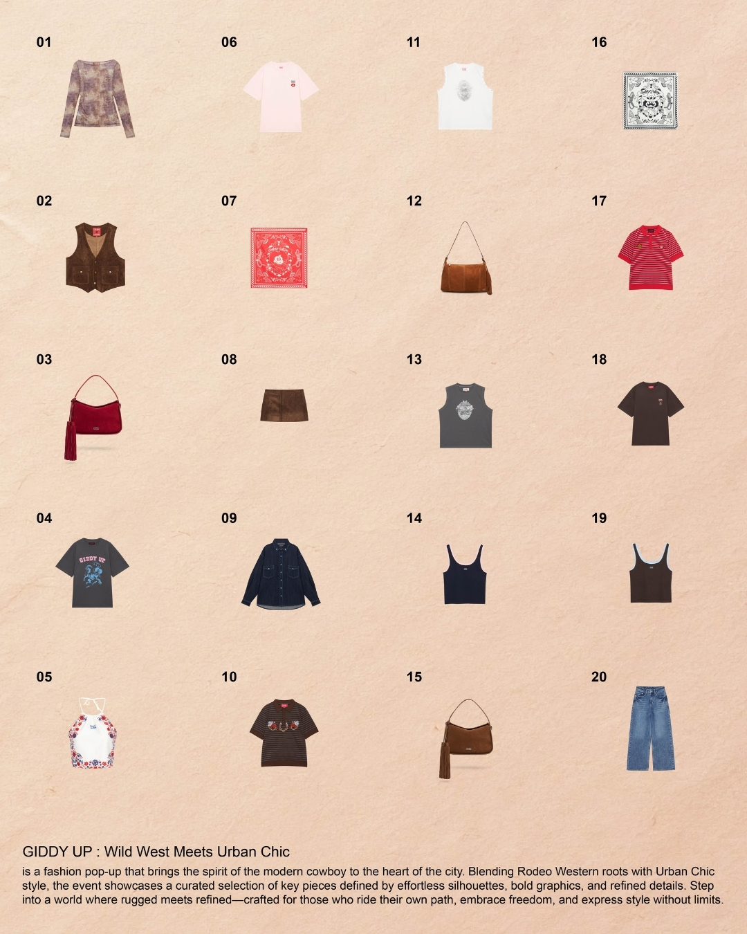“Ride into style. Saddle up. It’s time to Giddy Up.” GIDDY UP ถ่ายทอดกลิ่นอาย “modern cowboy” ที่ผสานความดิบเท่ของ Wild West เข้ากับความเรียบหรูแบบเมืองใหญ่ ผ่านซิลูเอตที่ใส่ง่าย รายละเอียดหนังพรีเมียม และไอเท็มเด่นที่สะท้อนความร่วมสมัย