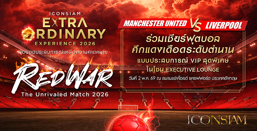 ไอคอนสยาม แลนด์มาร์กระดับโลกริมแม่น้ำเจ้าพระยา ตอกย้ำความเป็น Global Experiential Destination ด้วยแคมเปญสุดเอ็กซ์คลูซีฟ “THE EXTRAORDINARY EXPERIENCE 2026 : RED WAR The Unrivaled Match 2026” ชวนลูกค้าคนพิเศษไปเชียร์ทีมโปรดกับศึกแดงเดือดระดับตำนาน “แมนเชสเตอร์ ยูไนเต็ด” ปะทะ “ลิเวอร์พูล” แบบสดๆ ติดขอบสนาม รับชมแมตช์แดงเดือดพร้อมสัมผัสประสบการณ์ VIP สุดพิเศษ จากที่นั่งโซน Executive Lounge ณ สนามโอลด์ แทรฟฟอร์ด เมืองแมนเชสเตอร์ ประเทศอังกฤษ สิทธิพิเศษนี้สำหรับ 8 สุดยอดนักช็อป ลูกค้าคนสำคัญของไอคอนสยามเท่านั้น